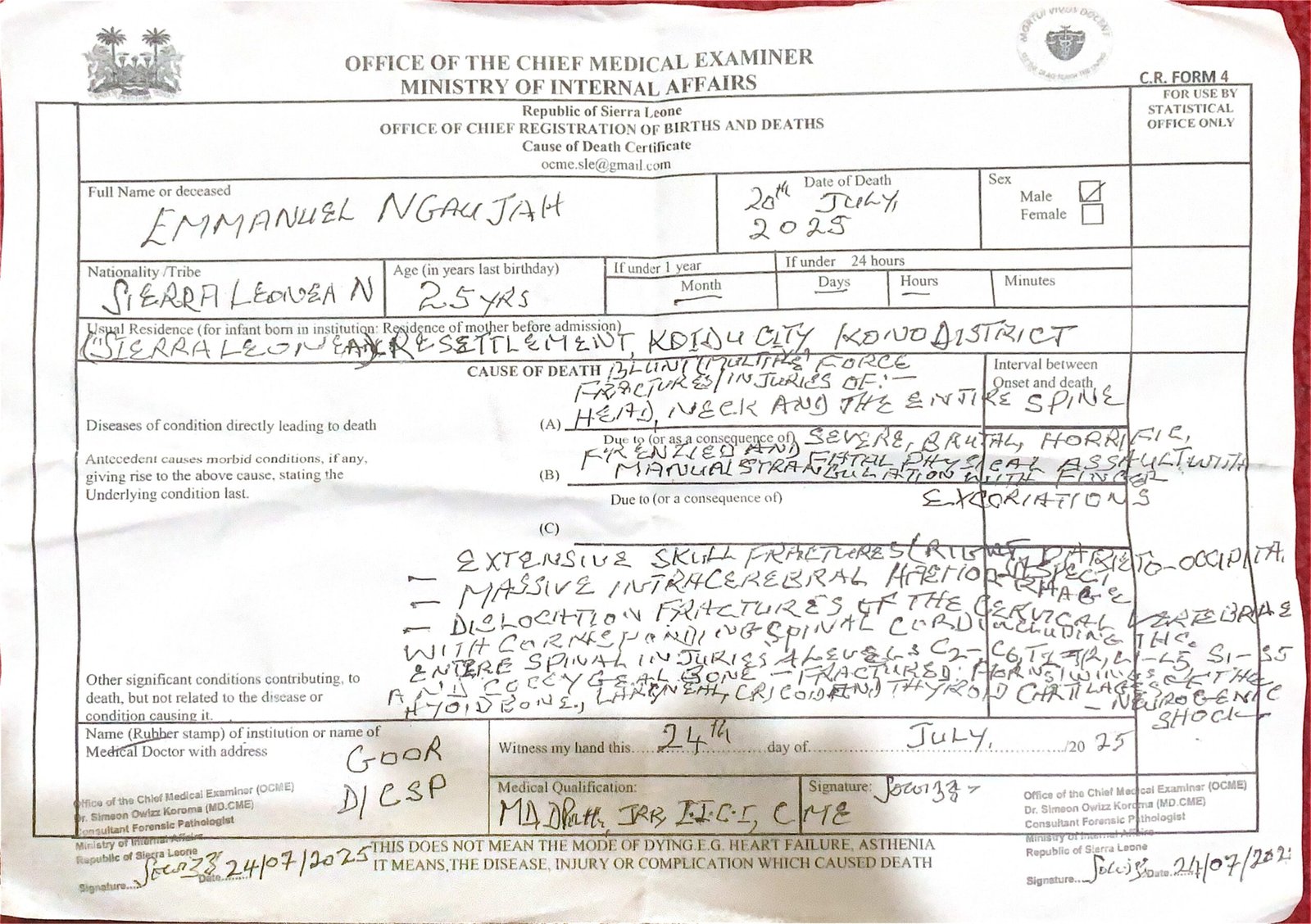According to Gbama, he was out of town on July 21, 2025, when he received a call informing him of his son’s death. Upon arrival, he went to the hospital where the body had been taken and was told it was in the mortuary. Upon identifying the body, he saw bruises, scars on the hands, and head wounds.